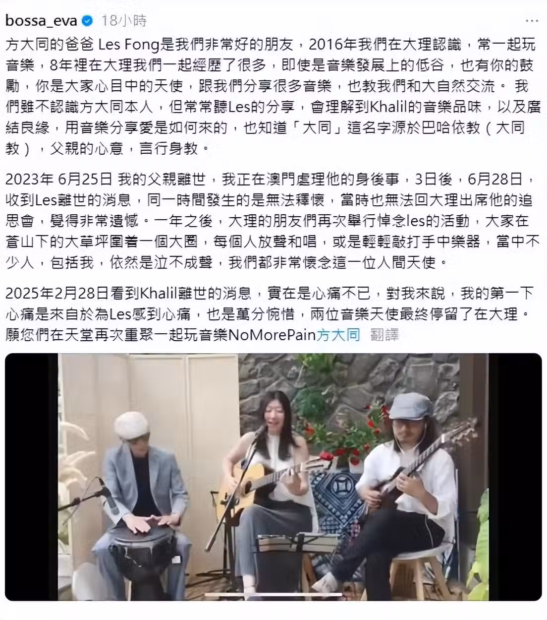 (3日)澳門唱作歌手林詩敏在社媒貼上與方大同爸爸的合照並說:「方大同的爸爸 Les Fong是我們非常好的朋友,2016年我們在大理認識,常一起玩音樂,8年里在大理我們一起經歷了很多,即使是音樂發展上的低谷,也有你的鼓勵,你是大家心目中的天使,跟我們分享很多音樂,也教我們和大自然交流。」