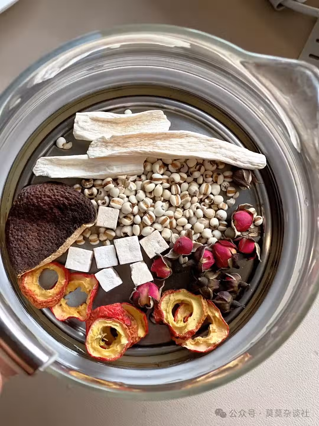 茯苓10g | 山藥15g | 薏米10g | 玫瑰花6朵 | 山楂5片 | 陳皮3g | 水600ml