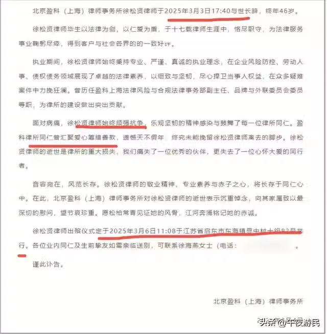 訃告還指出,在徐松賢律師生病期間,盈科律所的同事還曾為她組織過愛心捐款,這也能證明出她的去世,並不是得的突發疾病或者遇到遭到意外。