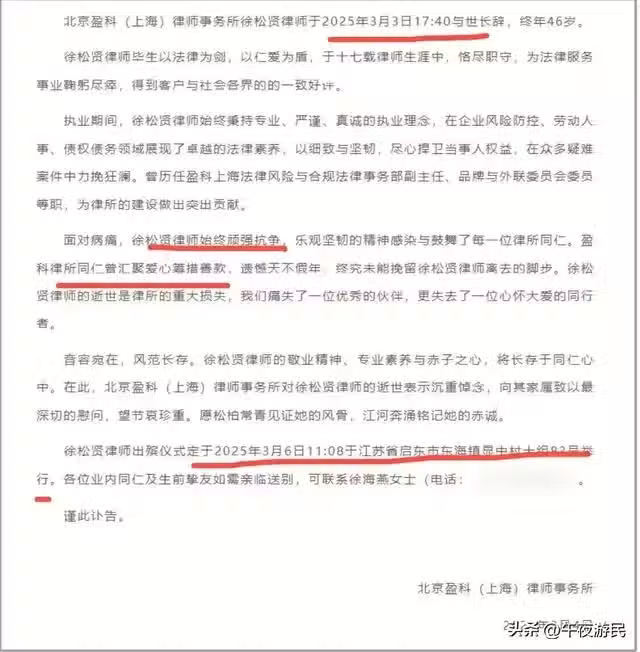 訃告還指出,在徐松賢律師生病期間,盈科律所的同事還曾為她組織過愛心捐款,這也能證明出她的去世,並不是得的突發疾病或者遇到遭到意外。