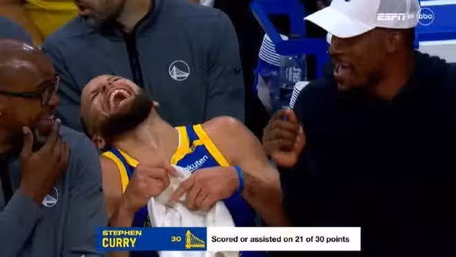 這個球一出來你就知道為什麼,巴特勒籃球智商這麼高,而且這麼符合勇士的體系,他知道現在什麼球能夠一球殺死尼克斯的希望,掐滅他們的反擊氣焰。他自己上個籃兒頂多拿兩分,尼克斯不投降,庫里三分一進,那就直接認輸了,所以他選擇把球傳出來了。這個球應該是這一場最誇張的鏡頭了,也是最讓庫里開心的鏡頭,他終於等來了一個懂他的超級巨星。