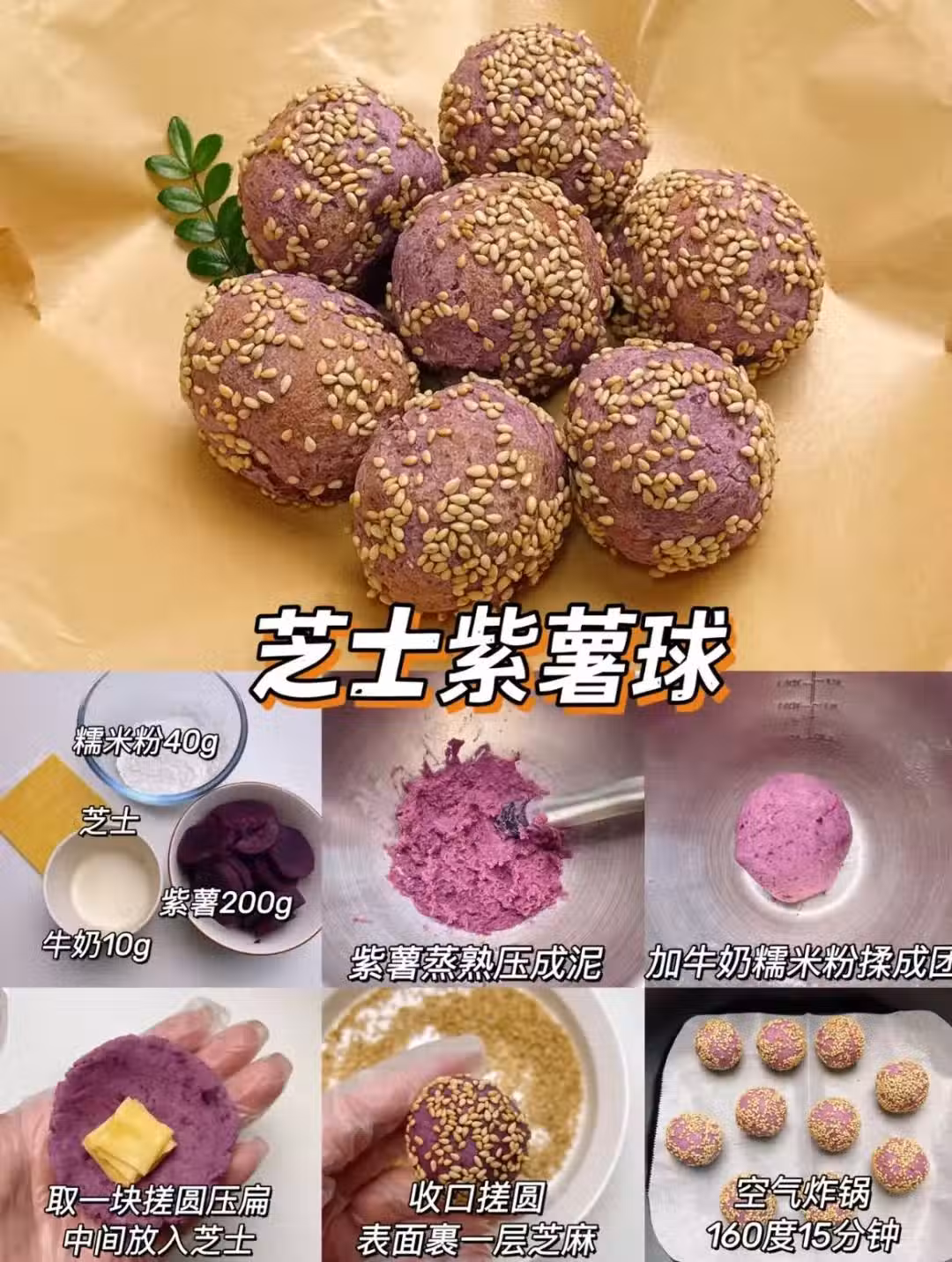 1️⃣200g紫薯蒸熟搗成泥,加入糯米粉揉成團