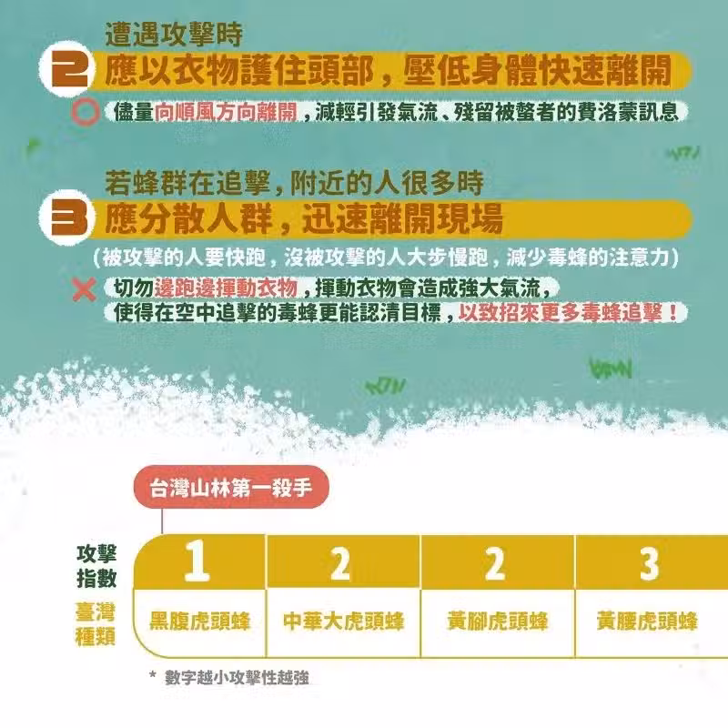 2、遭遇攻擊時,應以衣物護住頭部,壓低身體,快速離開(儘量向順風方向離開,減輕引發氣流、殘留被螫者的費洛蒙訊息)
