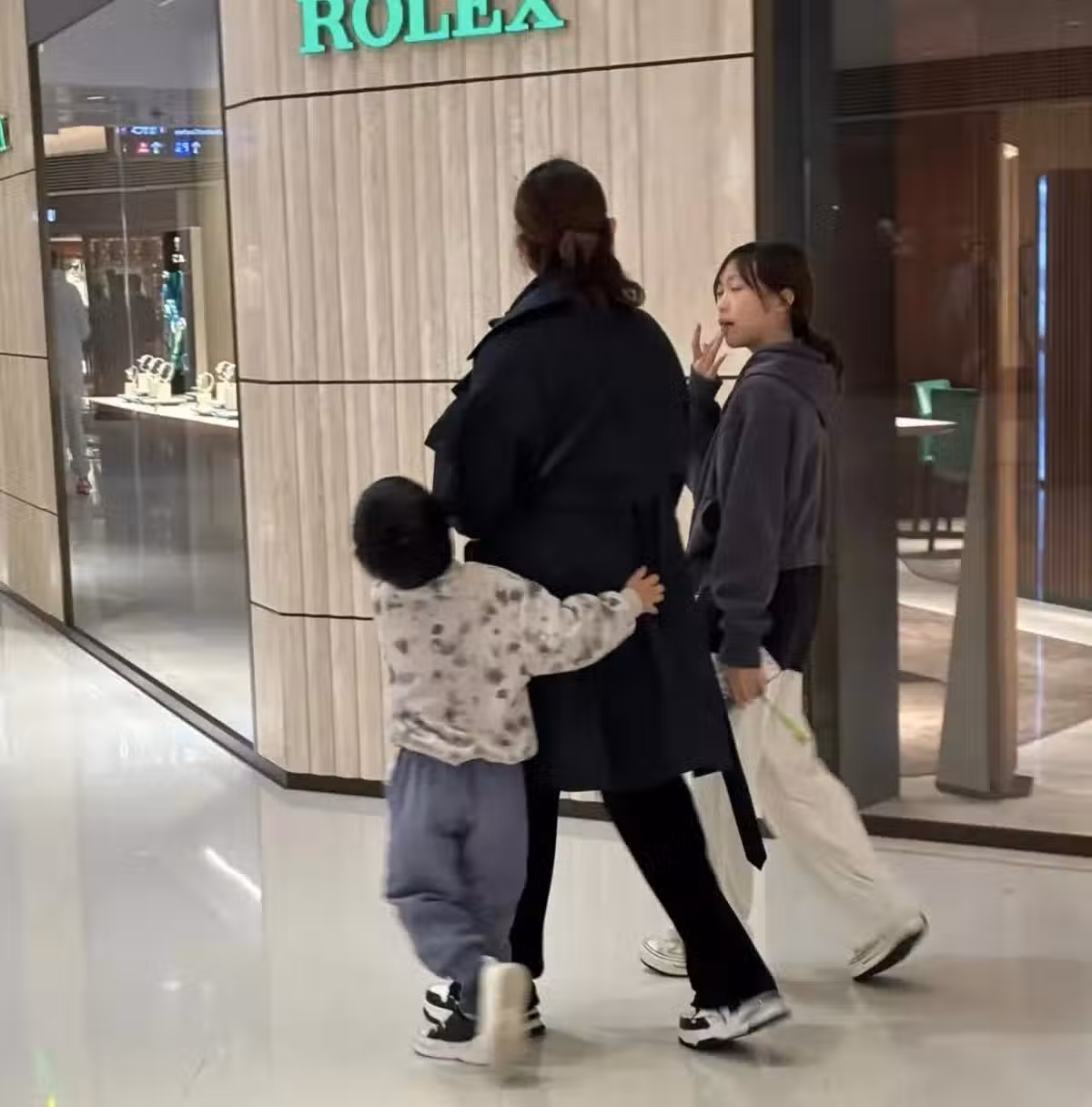 52歲蔡少芬香港西九龍逛商場,一邊牽著兒子,一邊和女兒聊天,畫面非常溫馨