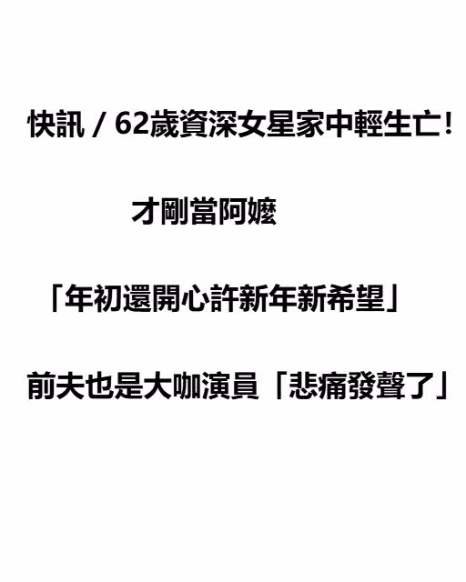 快訊/62歲資深女星家中輕生亡!才剛當阿嬤「年初還開心許新年新希望」 前夫也是大咖演員「悲痛發聲了」
