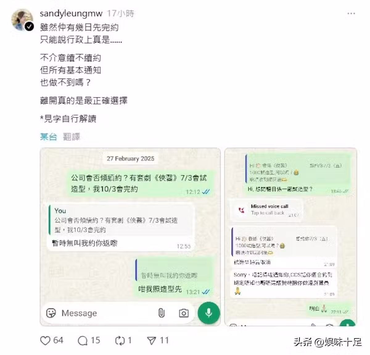 她就在社交平台寫到雖然自己還有幾天才約滿,但只能說TVB的行政上真是無語……自己也不介意續不續約,但起碼要有個基本通知,這麼大公司也做不到嗎?離開真的是最正確選擇!言語間明顯帶著不滿情緒,暗示自己與TVB之間的關係早已生變。