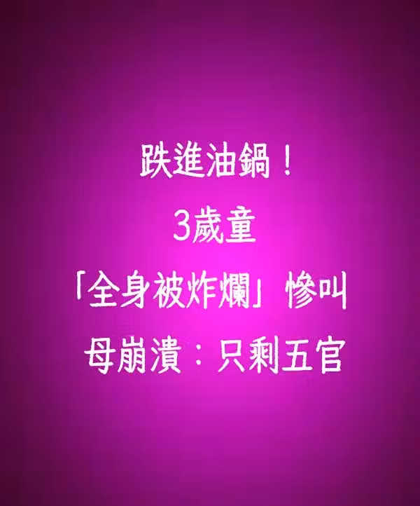 一名3歲男童和小朋友追逐打鬧,結果不慎跌進滾燙油鍋,男童送醫後全身65%的面積燒傷,媽媽看了崩潰喊「就像被剝了皮的羔羊一樣」。