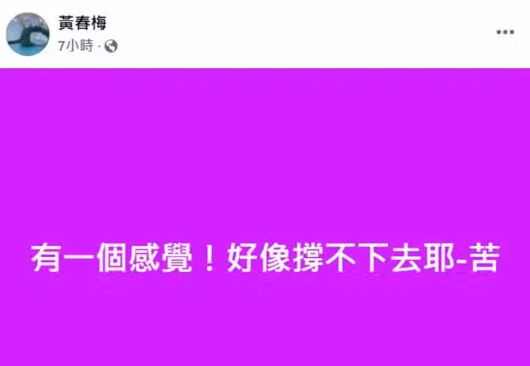 9日深夜,大S媽媽黃春梅更新動態:有一個感覺!好像撐不下去了,苦!