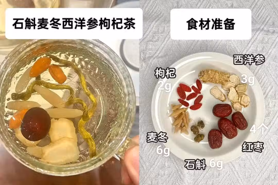 石斛6g、麥冬6g、西洋參3g、枸杞2g、紅棗4顆(去核)