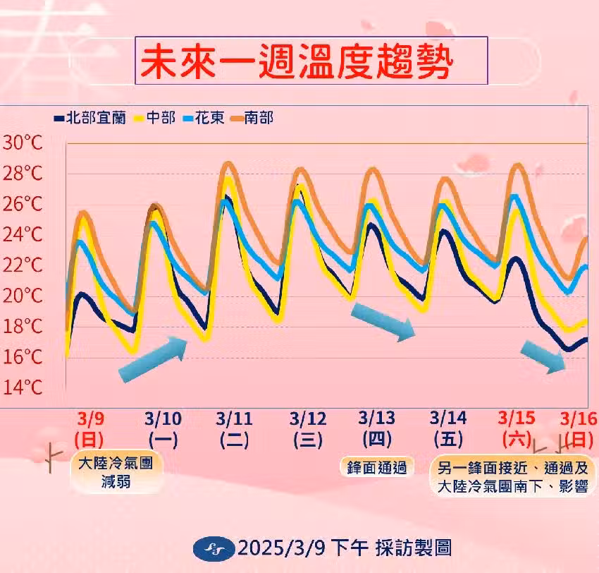 周日全台天氣最為寒冷,夜間低溫將大幅下降,中部以北及宜蘭地區低溫約13至14度,南部及花東地區則在16至18度之間。