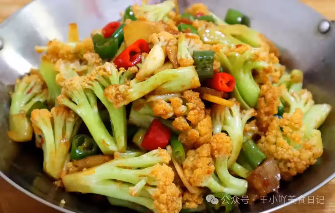 合炒:倒入炒好的菜花,加生抽、蚝油、鹽、雞精,大火翻炒均勻即可。