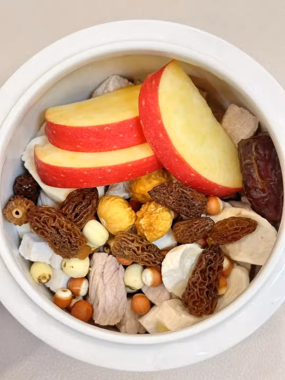 準備食材:羊肚菌適量、山藥15-20克、蓮子10克、茯苓10克、芡實10克、無花果3個、蘋果半個 、椰棗1個