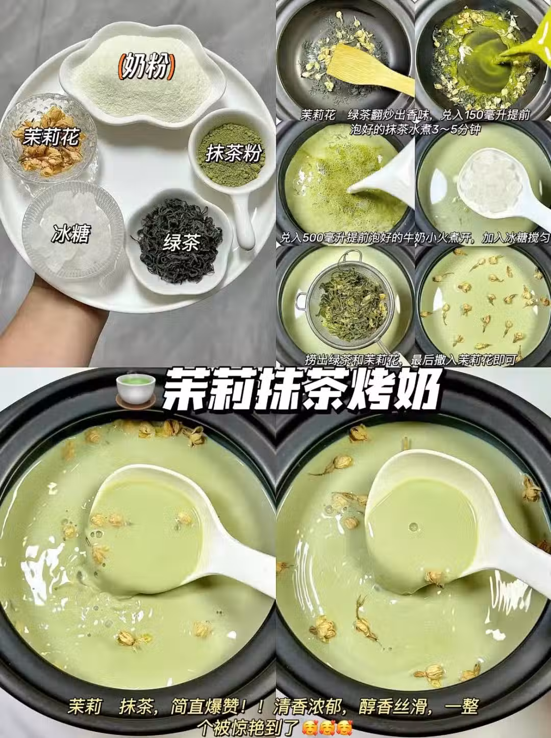 1️⃣茉莉花、綠茶炒出香味,加入150ml提前泡好的抹茶水煮5分鐘