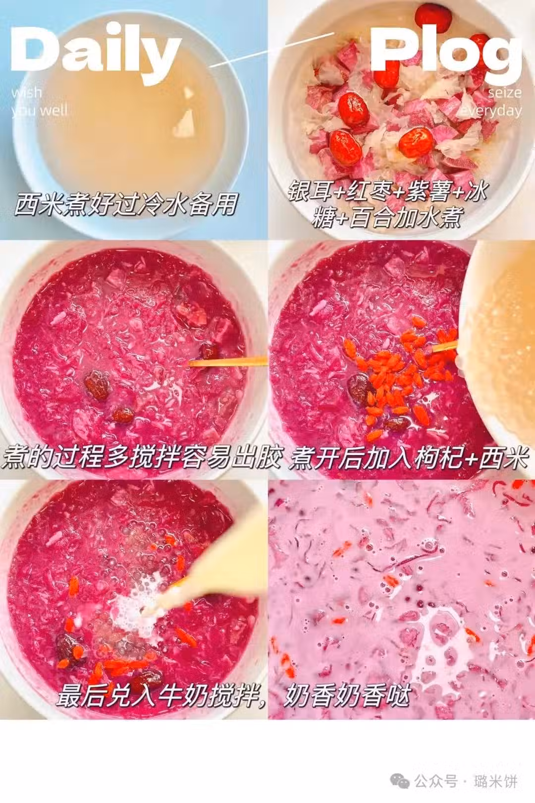 4. 煮好後加入枸杞和西米,倒入牛奶,攪拌均勻。一碗香甜可口、美容養顏的紫薯銀耳西米露就完成啦!