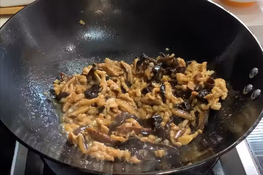 步驟4:起鍋燒油,加入香菇和木耳翻炒片刻,再加肉絲一起翻炒,加些鹽、生抽、老抽和料酒調味,撒些蔥,翻炒均勻就可以出鍋了。