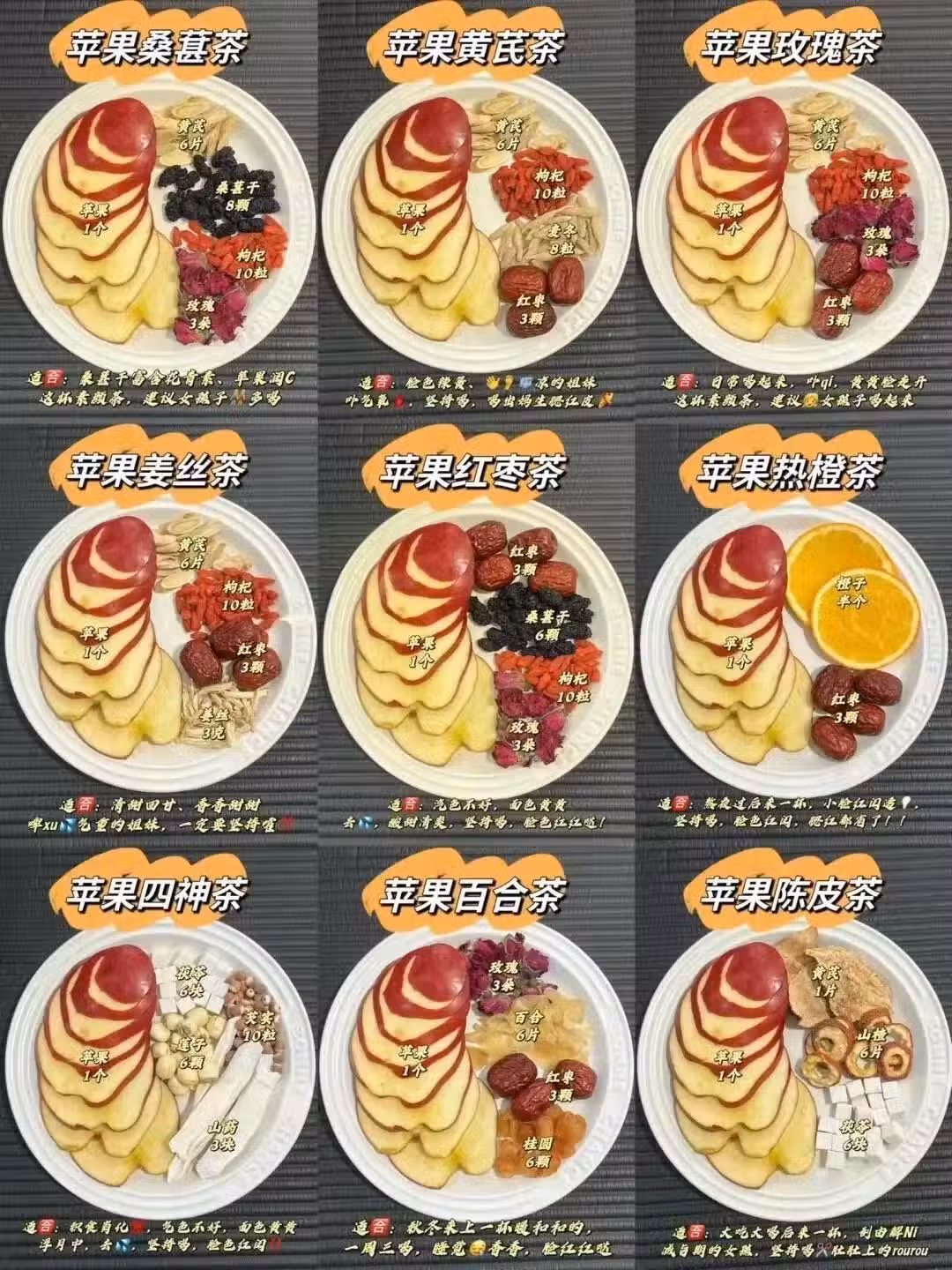 蘋果1個+枸杞10粒+玫瑰3朵+紅棗3顆+黃芪6片