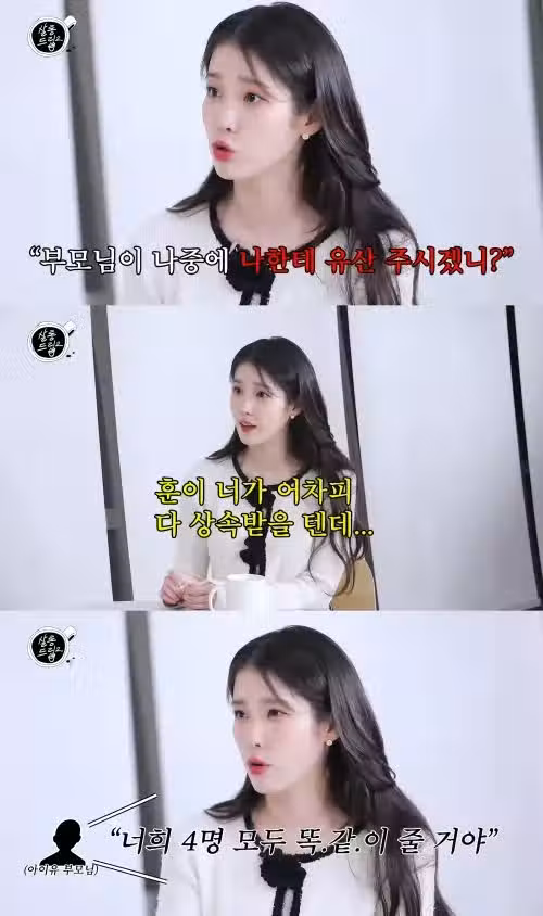 資產超過573億韓元(約台幣14億元)的IU(李知恩),近日上張度練的節目《살롱드립》透露,已經放棄繼承爸媽的財產,決定全部留給弟弟,希望弟弟可以好好孝順父母,並對弟弟說:「爸媽以後離開了,難道會留遺產給我嗎?反正到時候都是你繼承啊!」