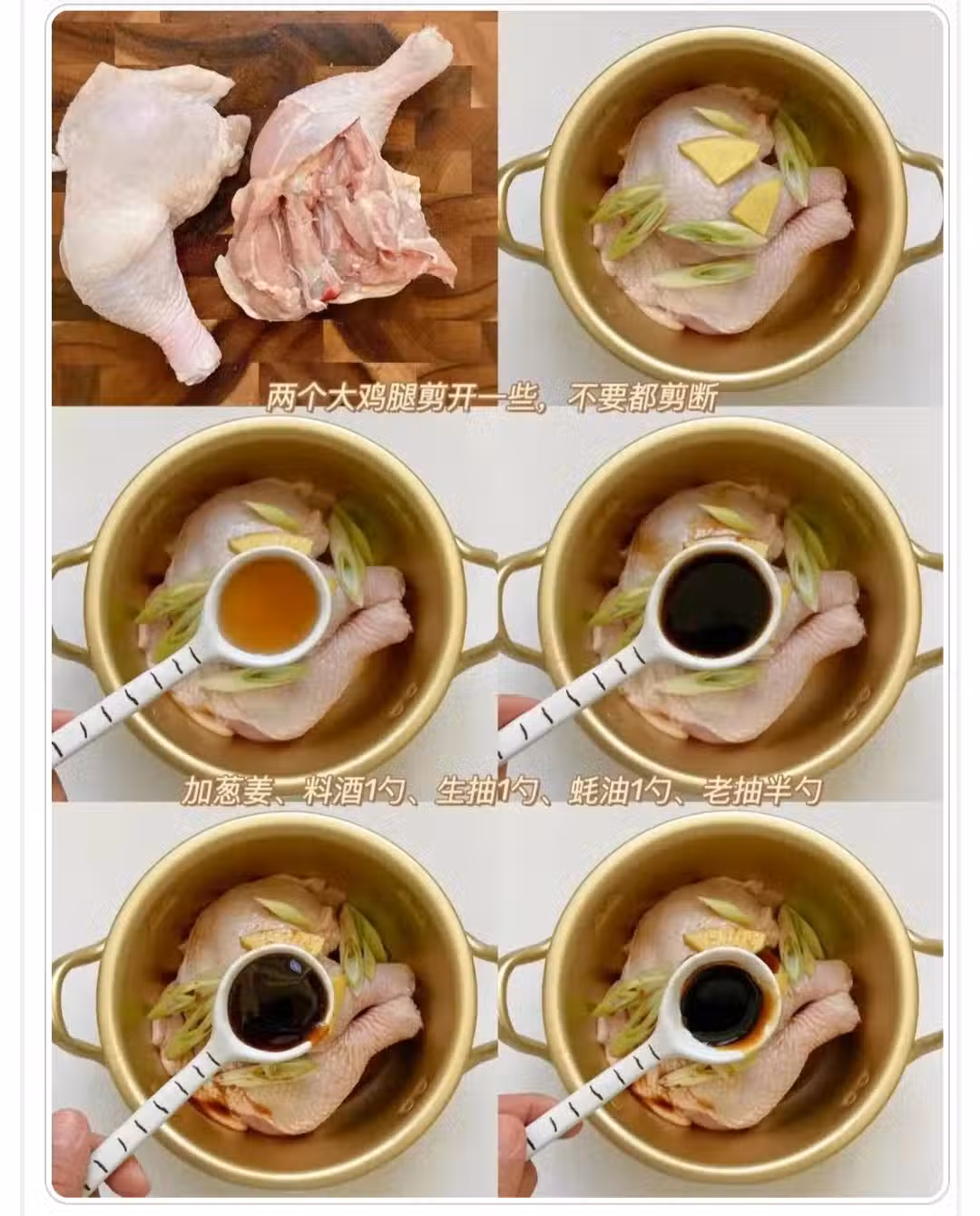 》兩個大雞腿開一些,不要切斷。加姜蔥+1勺料酒+1勺生抽+1勺蚝油+老抽拌勻+2勺奧爾良蜜汁腌料