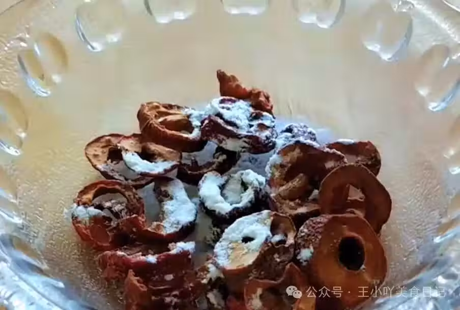 加入少許普通麵粉和適量清水,用手輕輕抓洗約1分鐘。麵粉的吸附作用能有效去除山楂干表面的灰塵和雜質。