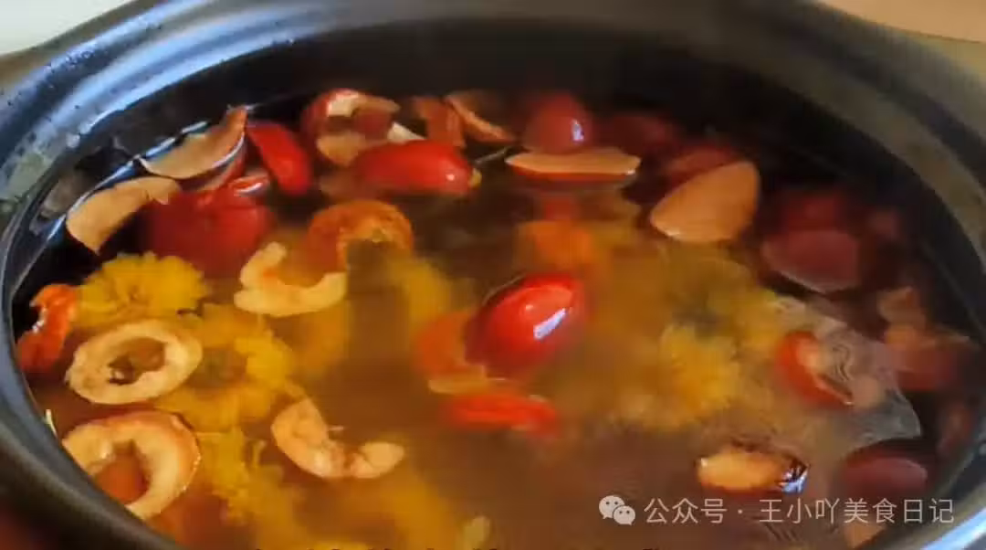 將處理好的山楂干、菊花和紅棗全部倒入砂鍋中。