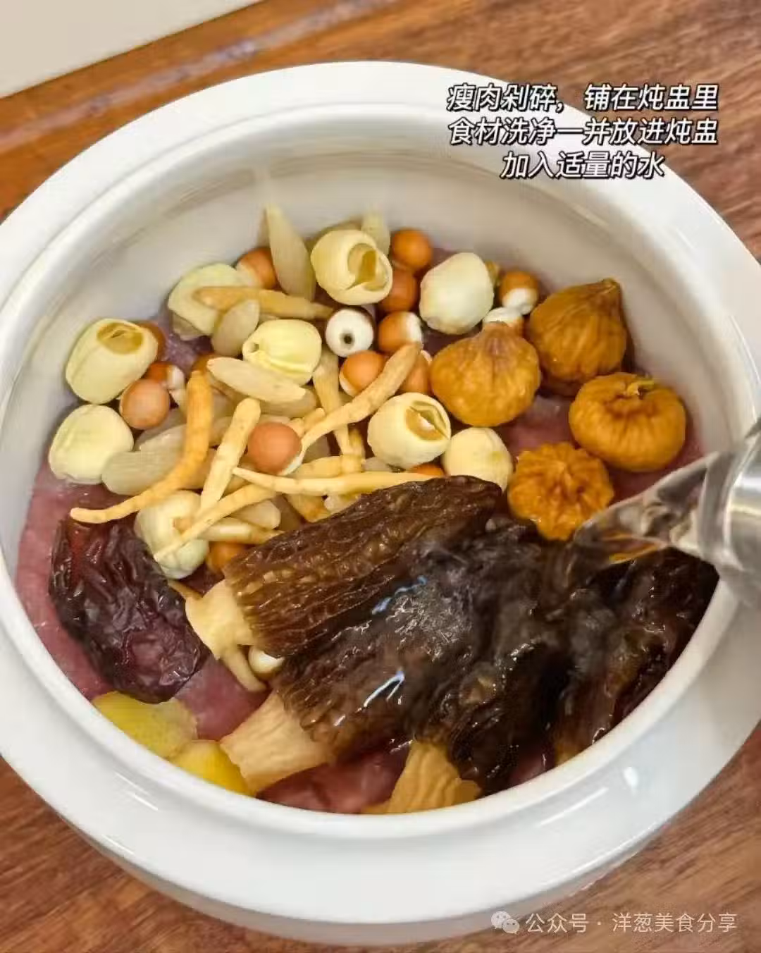 瘦肉剁成揉碎,鋪在燉盅里,其他食材洗凈一併放入燉盅,加入適量的清水