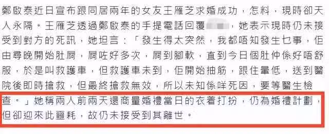 當下媒體已聯繫上王雁芝,她接受採訪直言難以接受對方的死訊,坦言這兩日兩人還商討婚禮一事,商量婚禮當日的衣著打扮。 沒想到卻迎來此噩耗,而關於鄭啟泰去世的原因,因為事出太突然,需要等醫生進一步檢查。