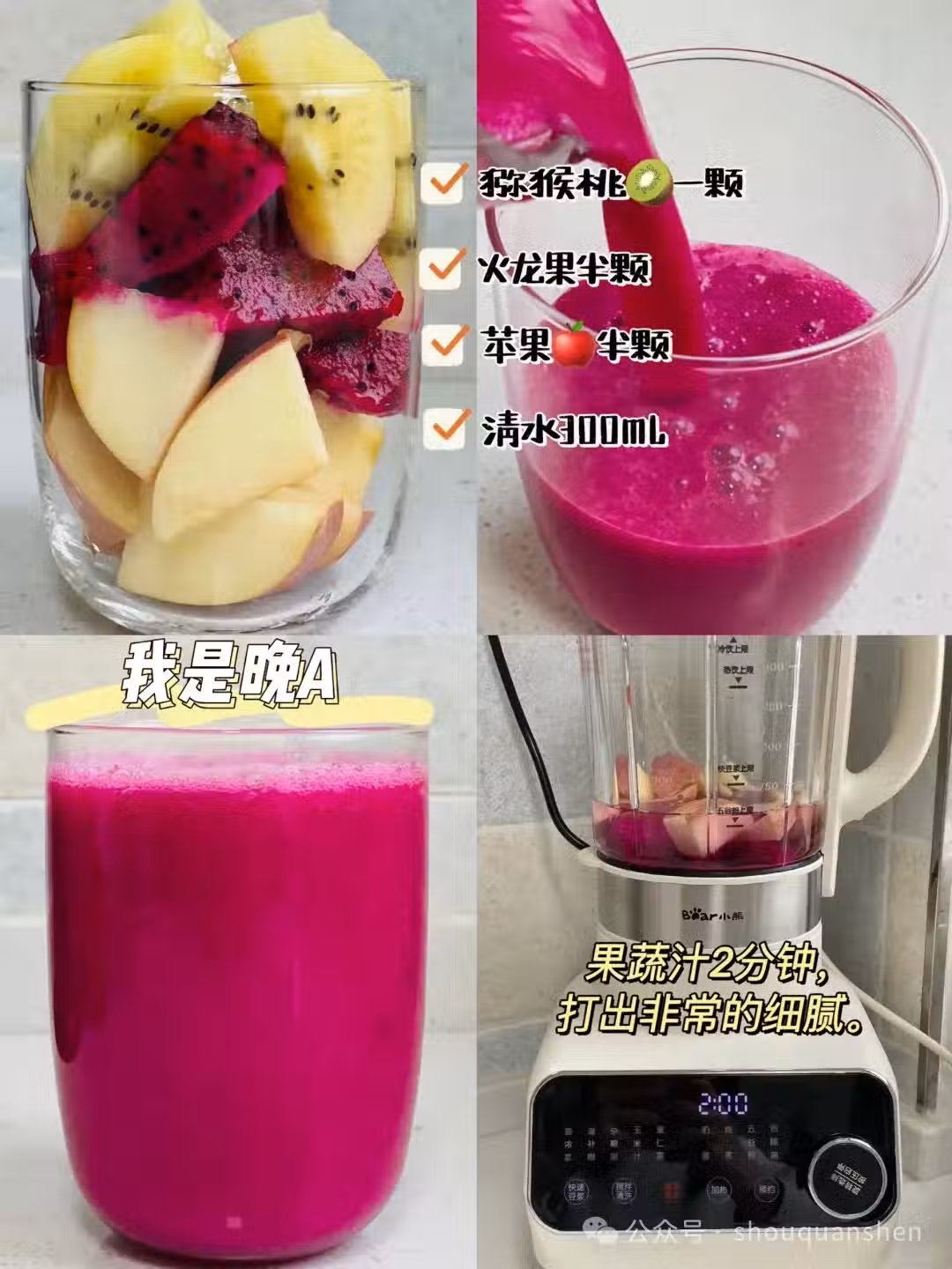 這款果蔬汁富含獼猴桃的維生素C,能夠幫助增強免疫力,促進脂肪燃燒。火龍果和蘋果的花青素成分,不僅有助於抗氧化,還能幫助塑造緊緻的肌膚。喝上一杯,既能幫助瘦身,還能維持皮膚的年輕狀態。