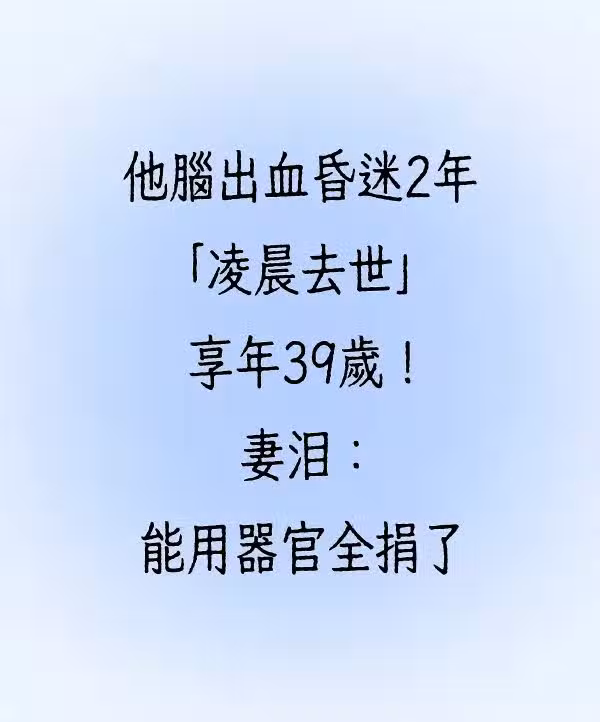 他腦出血昏迷2年「凌晨去世」享年39歲!妻淚:能用器官全捐了