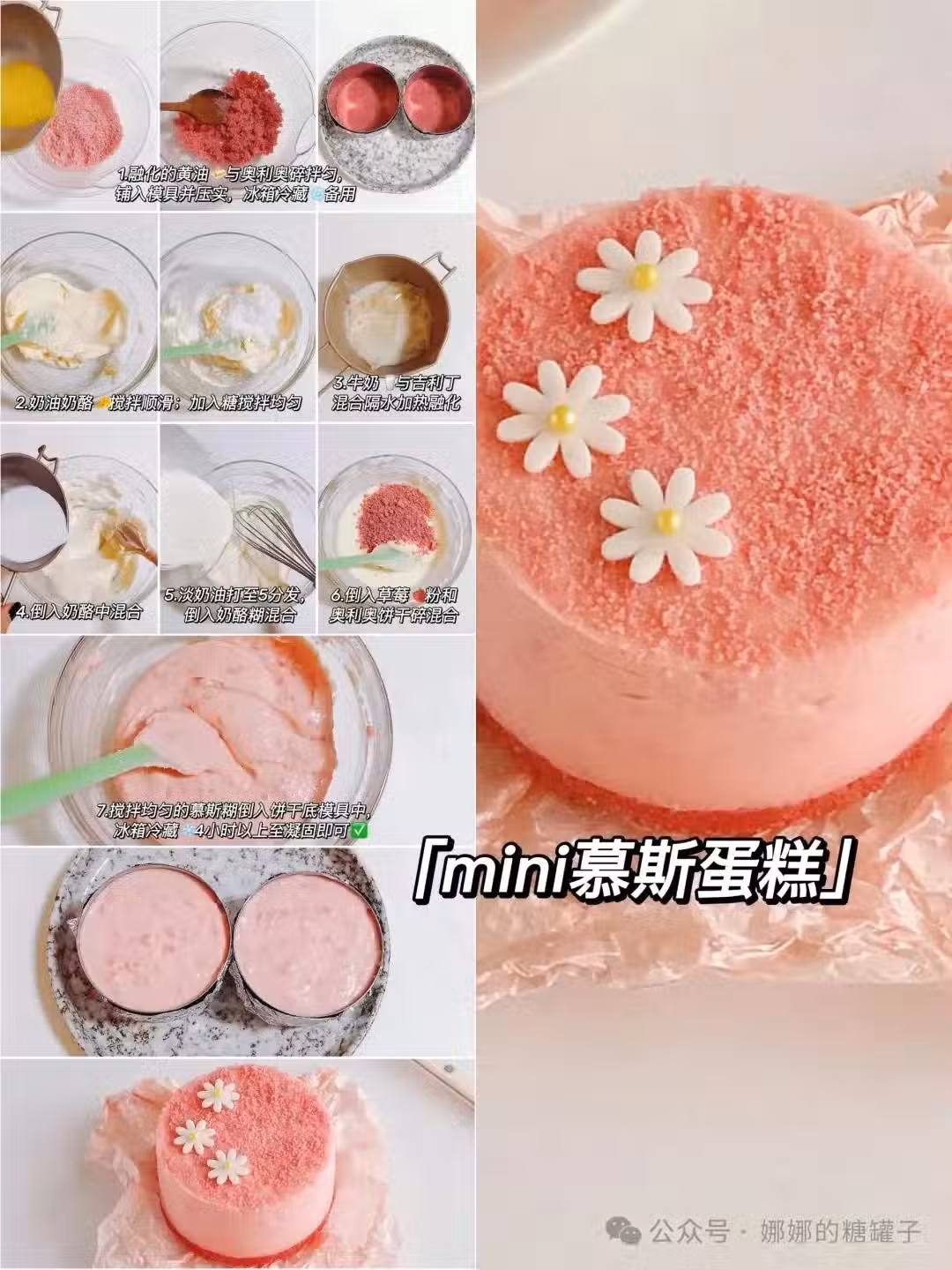 慕斯:酸奶180克、淡奶油150克、糖20克、牛奶50克、吉利丁片10克、草莓粉7克。