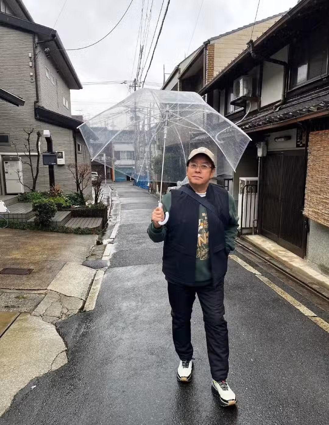 74歲譚詠麟去日本,在雨中散步,吃豪華蟹宴,對當地建築讚不絕口