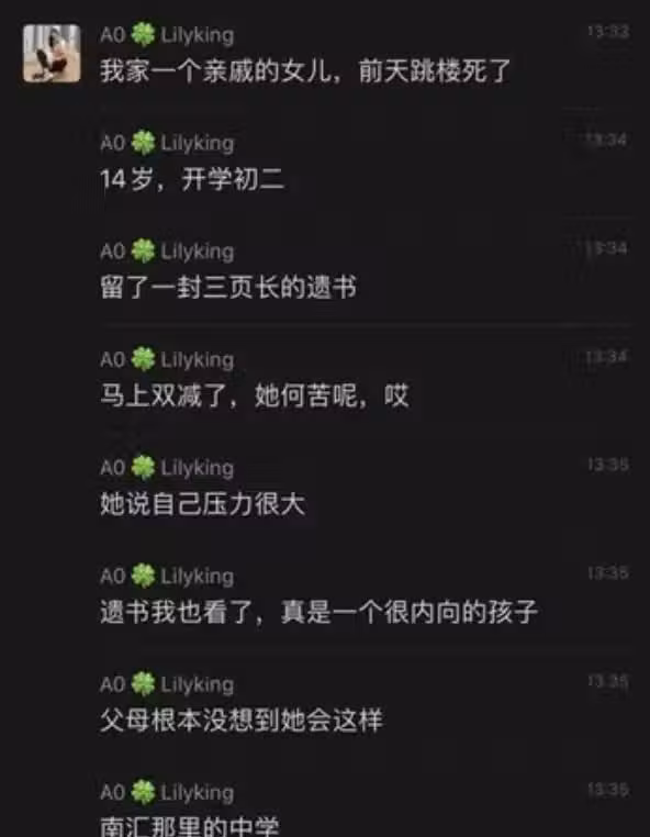根據綜合陸媒報導,該名先行一步的國中女親戚事後透過網絡表示,該女孩平時非常乖巧又內向,但因為成績總是達不到父母的期望,常常被認為是不夠努力用功,因此時不時就媽媽惡言相向、甚至還恨鐵不成鋼地常常動手,最後在承受不了長期的高壓之下,才選擇用這樣的方式解脫。