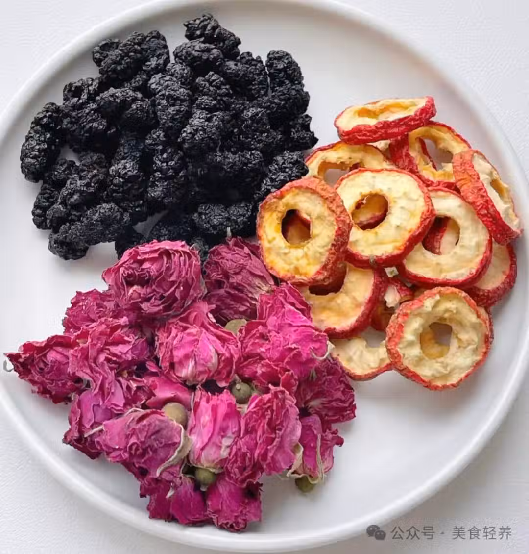 小貼士:玫瑰可以疏肝理氣,山楂消食行氣作用,桑椹滋陰生津,花青素很高,搭配一起疏肝理氣,滋養皮膚。