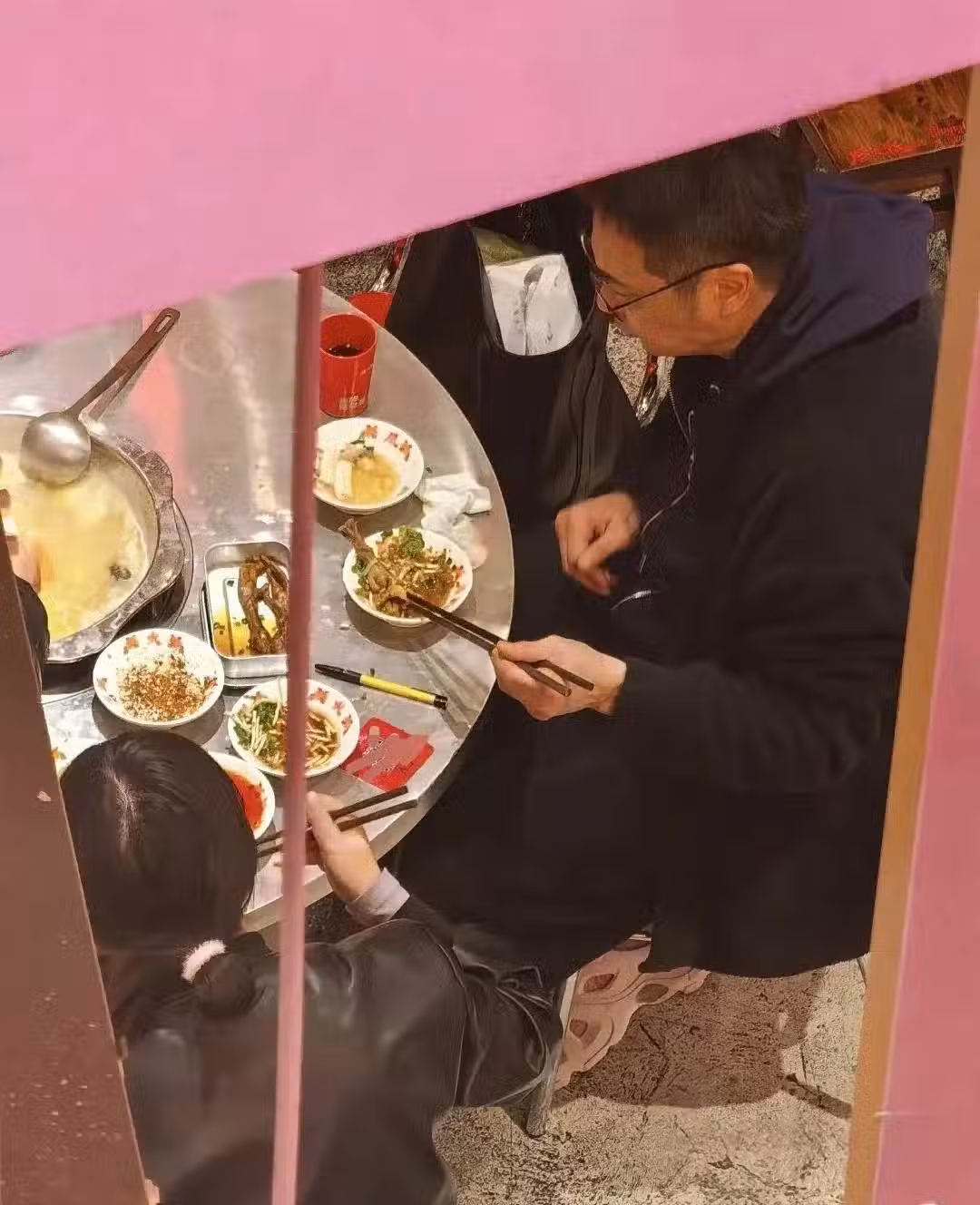 他是和兩位工作人員一起去的,三個人叫了一桌東西,有青菜有肉,大家都吃得很盡興!