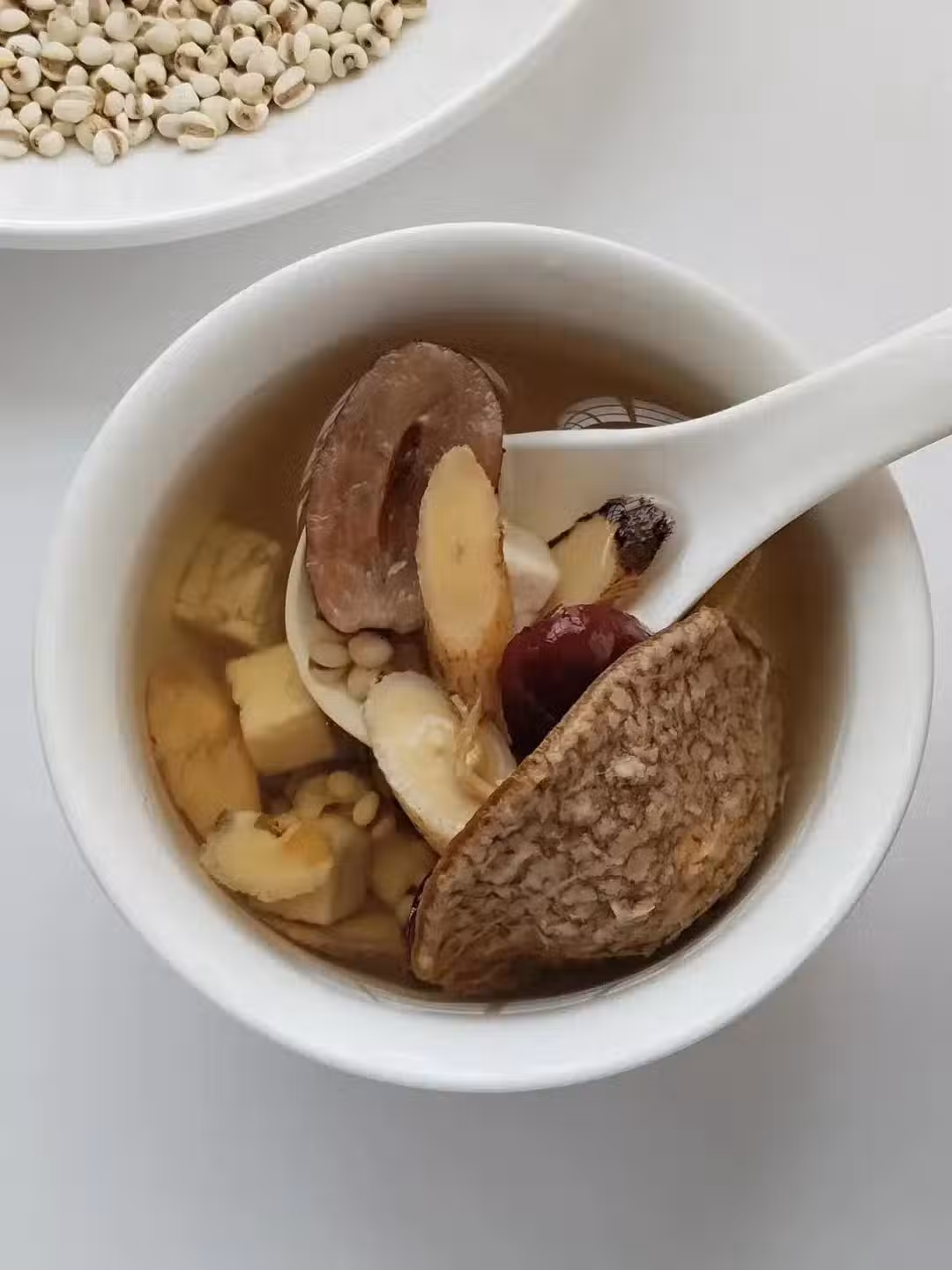 食材:炒薏米30g➕黃芪10g➕茯苓10g➕去核紅棗6顆➕陳皮一片