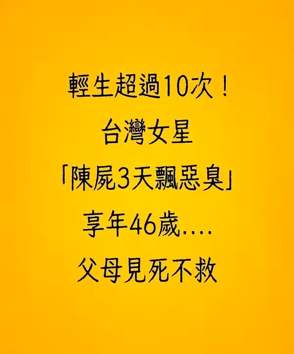 輕生超過10次!台灣女星「陳屍3天飄惡臭」享年46歲....父母見死不救!