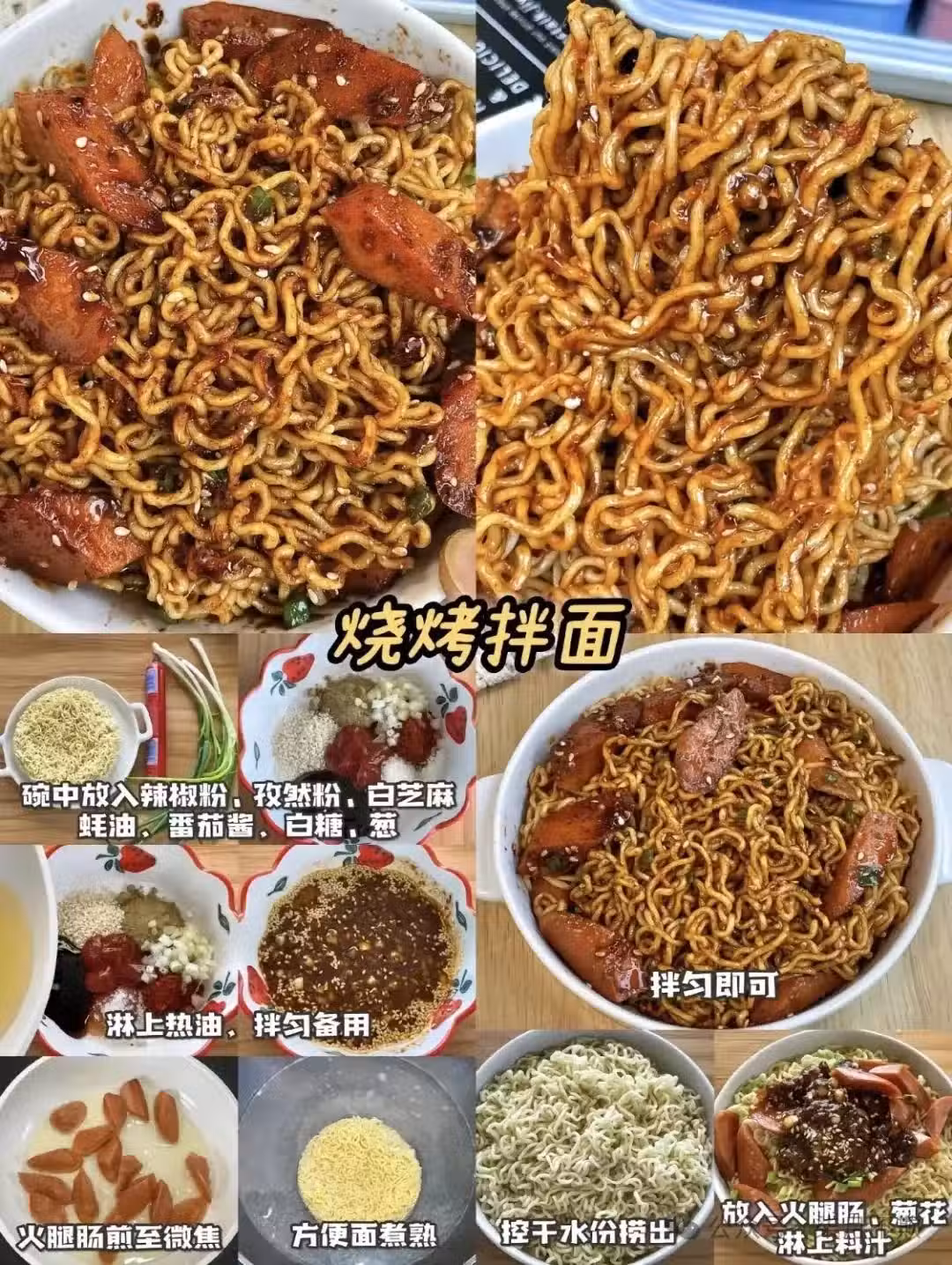 8️⃣ 泡麵新吃法來啦!孜然火腿面超絕! 把番茄醬、白糖、孜然粉等調料混合,淋上熱油激發出香味。火腿腸炸至焦脆,煮好的泡麵和火腿一同入碗,撒上蔥花,倒入料汁拌勻。每一口都能吃到酥脆火腿與香辣麵條,香麻了!