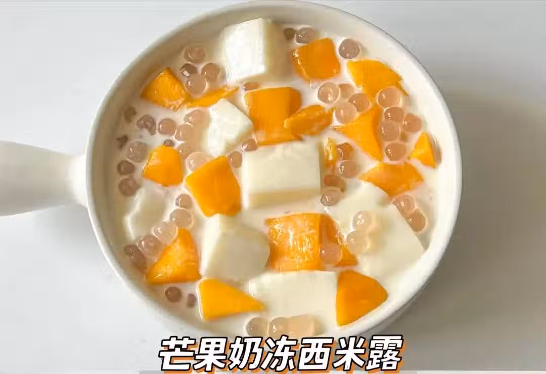 5. 冷藏好的奶凍切塊+芒果切塊+西米+適量牛奶或椰奶。