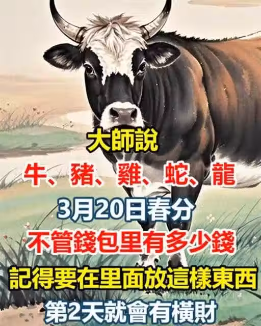 「春分晝夜平,五行轉乾坤」​,這句流傳千年的俗語揭開了春分改運的奧秘。 作為二十四節氣中陰陽平衡的轉折點,民間素有​「春分動一動,橫財進三斗」​的說法。 尤其對生肖屬牛、豬、雞、蛇、龍之人,今年春分恰逢甲辰龍年「金木交戰」的特殊天象,此時在錢包中放入特定物件,可激活「天財地庫」​的運勢密碼,究竟暗藏哪些玄機?