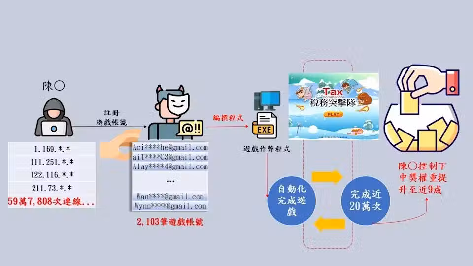 調查局說明,陳姓被告為牟取不法利益,涉嫌於 2024 年 8、9 月間陸續利用遊戲系統漏洞,藉由渠實際控制之 60 余組 Google 帳號,建立 2,000 余個遊戲帳號,再透過自行編撰之作弊程式,使每個遊戲帳號從登入遊戲到結束為止僅需花費 1 至 2 秒時間,活動期間即連線達 59 萬餘次,藉此增加中獎權重,終致在 52 個獎項中獲獎 44 個,獲獎機率達 84.6%,嚴重影響遊戲程式運行及其他民眾參與遊戲抽獎公平性。