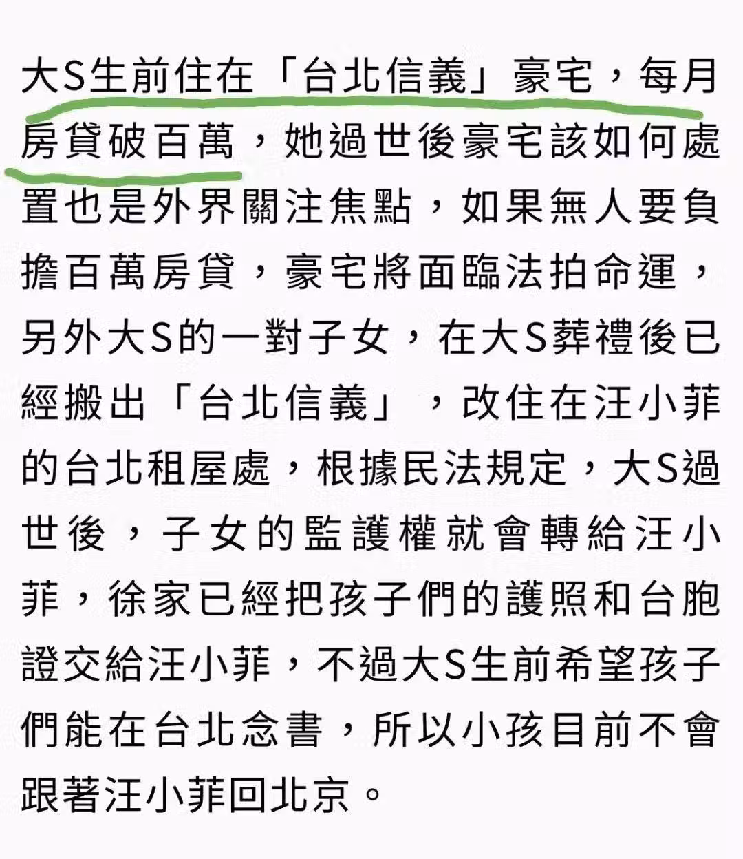 目前,具俊曄還沒有發表看法,徐家對這套房產也沒有表態,汪小菲則把一切事情交給了律師打理。