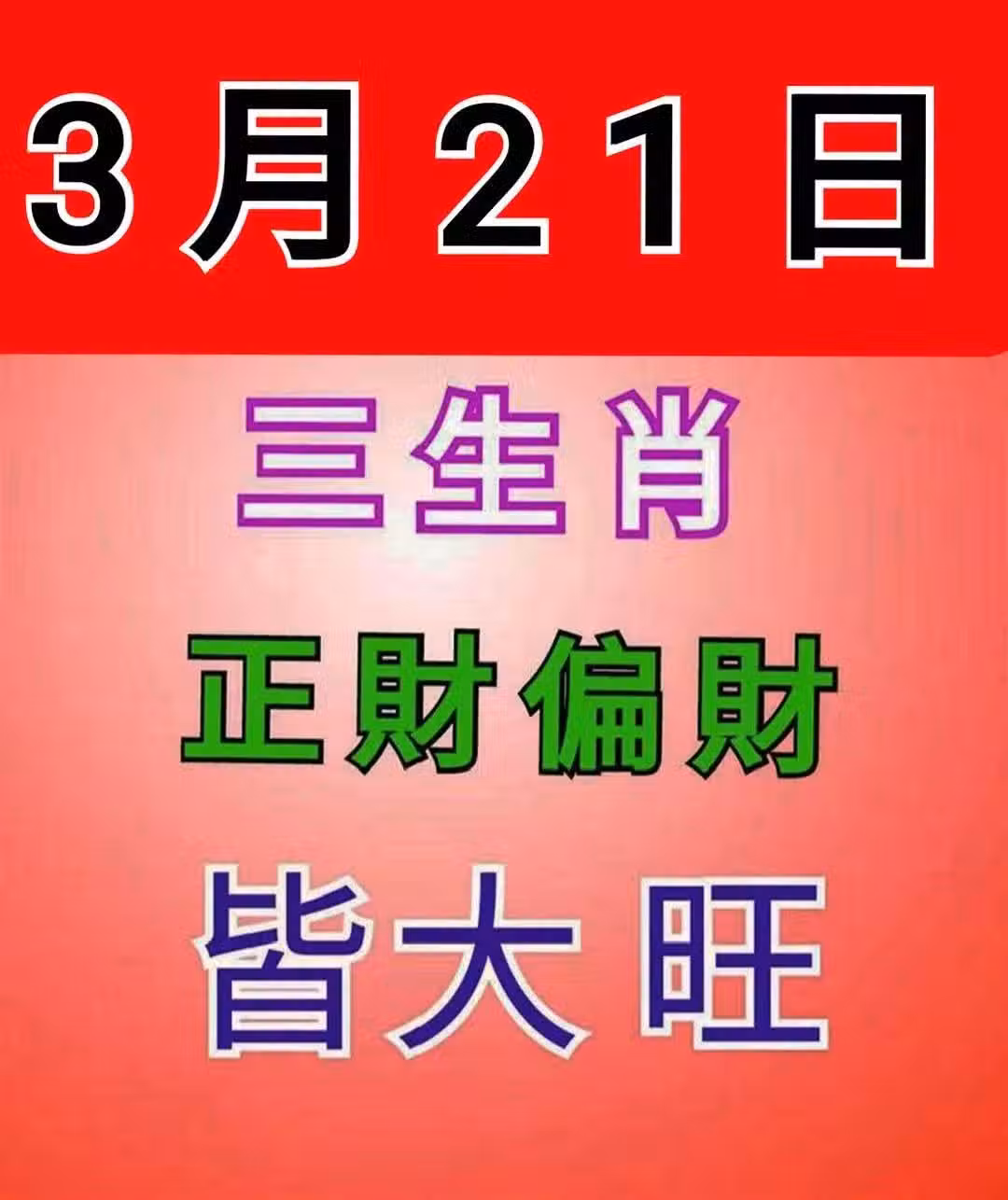 3月21日 三生肖 正財偏財「 皆大旺 」
