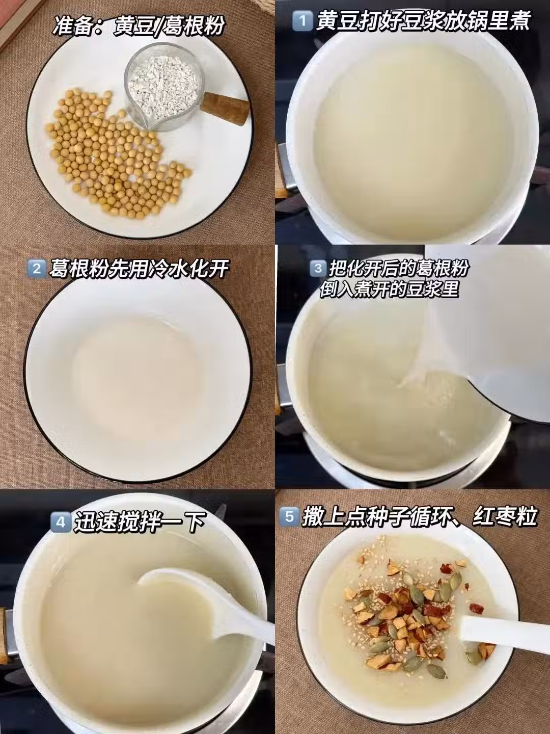3.等豆漿煮開了,把剛才化好的葛根粉倒進豆漿里。