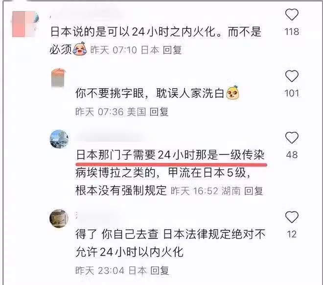 附有IP 地址是日本的網友稱,就在大S剛離世的時候,其實她的家人沒必要非得立馬就去火花,意思是說,如果不是得了一級傳染病像伊波拉之類的,是可以再等等的。況且,辦理起這樣的手續,也是需要很長時間,大S家人辦起這樣的事倒挺利索的。
