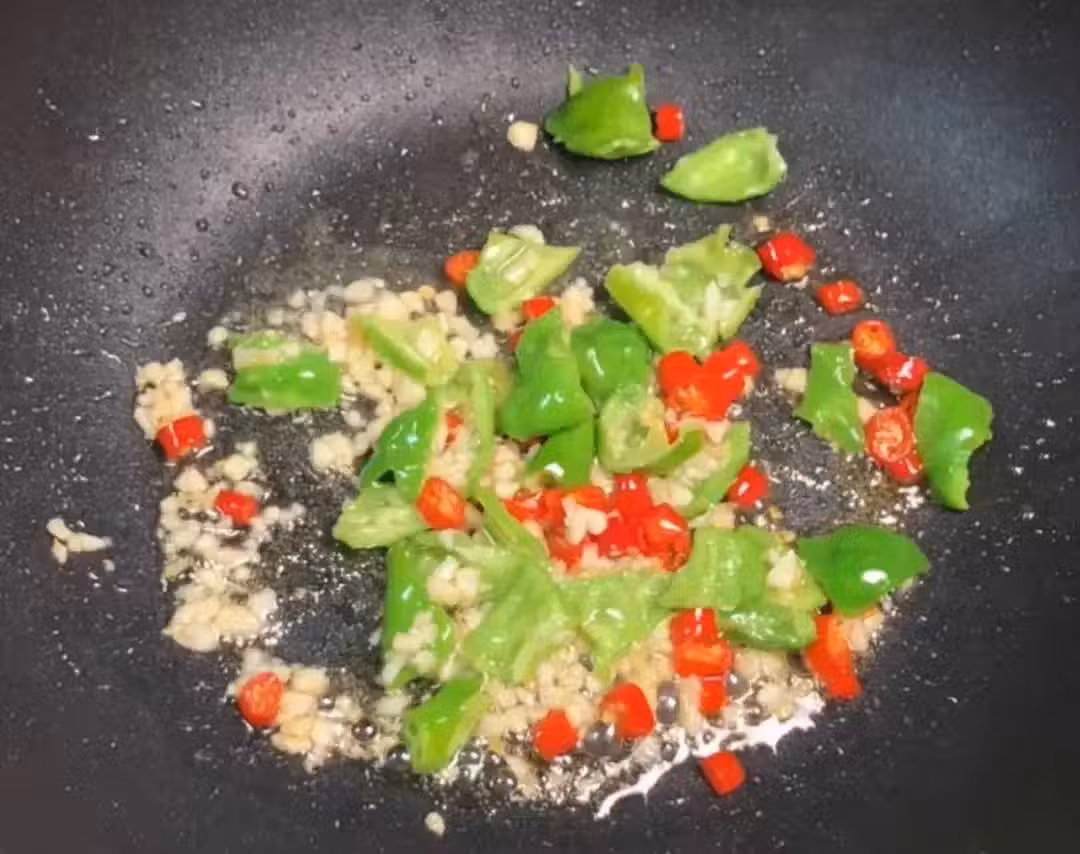 5️⃣鍋清洗乾淨後下入少量食用油。 量比平時炒菜少一些,因為茄子還是會自己帶一些油。 油熱下入蒜末,青紅辣椒炒香。