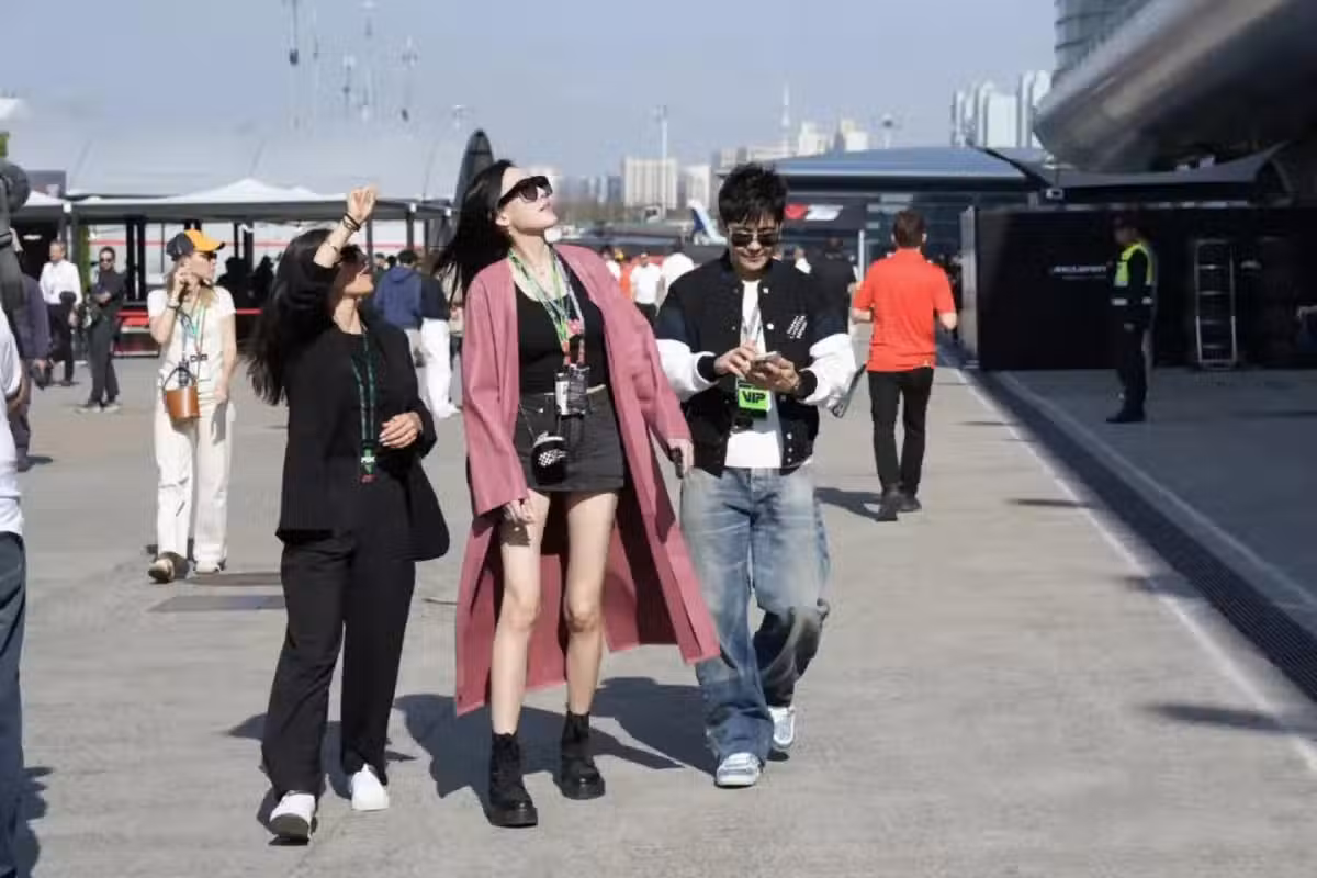 50歲林志穎在上海,去看賽車,老婆陳若儀露雙腿,在現場大出風頭