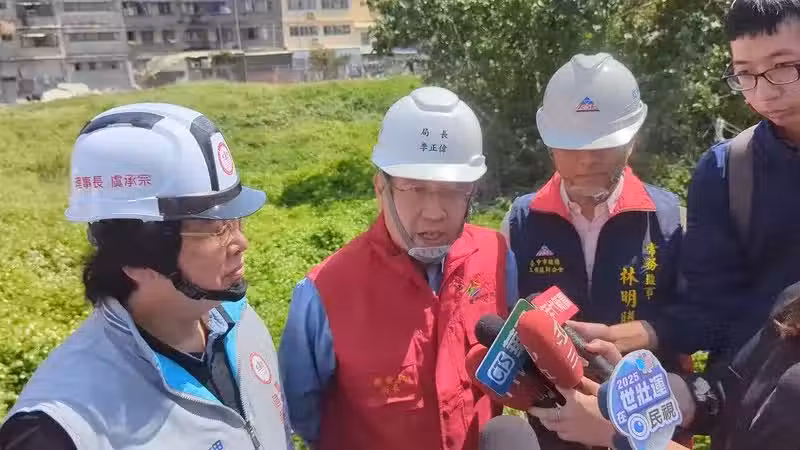 台中市清水區一處住宅22日凌晨5、6樓突然倒塌,幸未造成人員受困受傷。台中市都市發展局長李正偉(左二)受訪時表示,初步研判有海砂屋的狀況,但還需要取樣調查。(中央社)