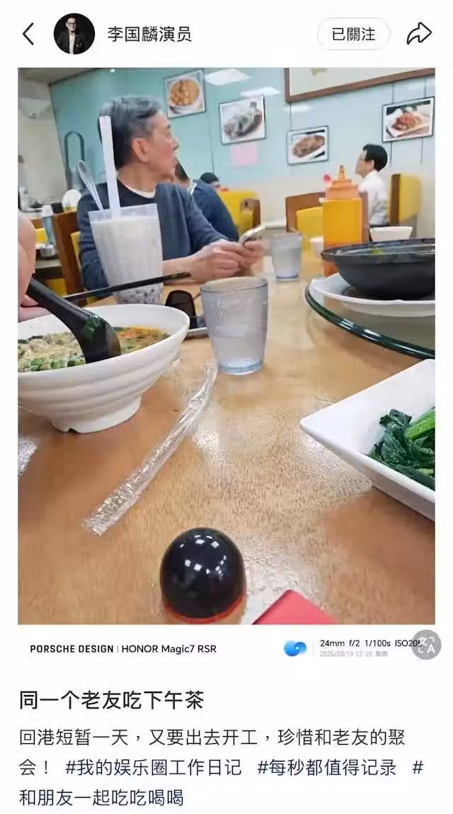 最近,李國麟在社交網上曬了一張和駱應鈞吃下午茶的照片,配文感慨:「同一個老友吃下午茶,回港短暫一天,又要出去開工,珍惜和老友的聚會。」