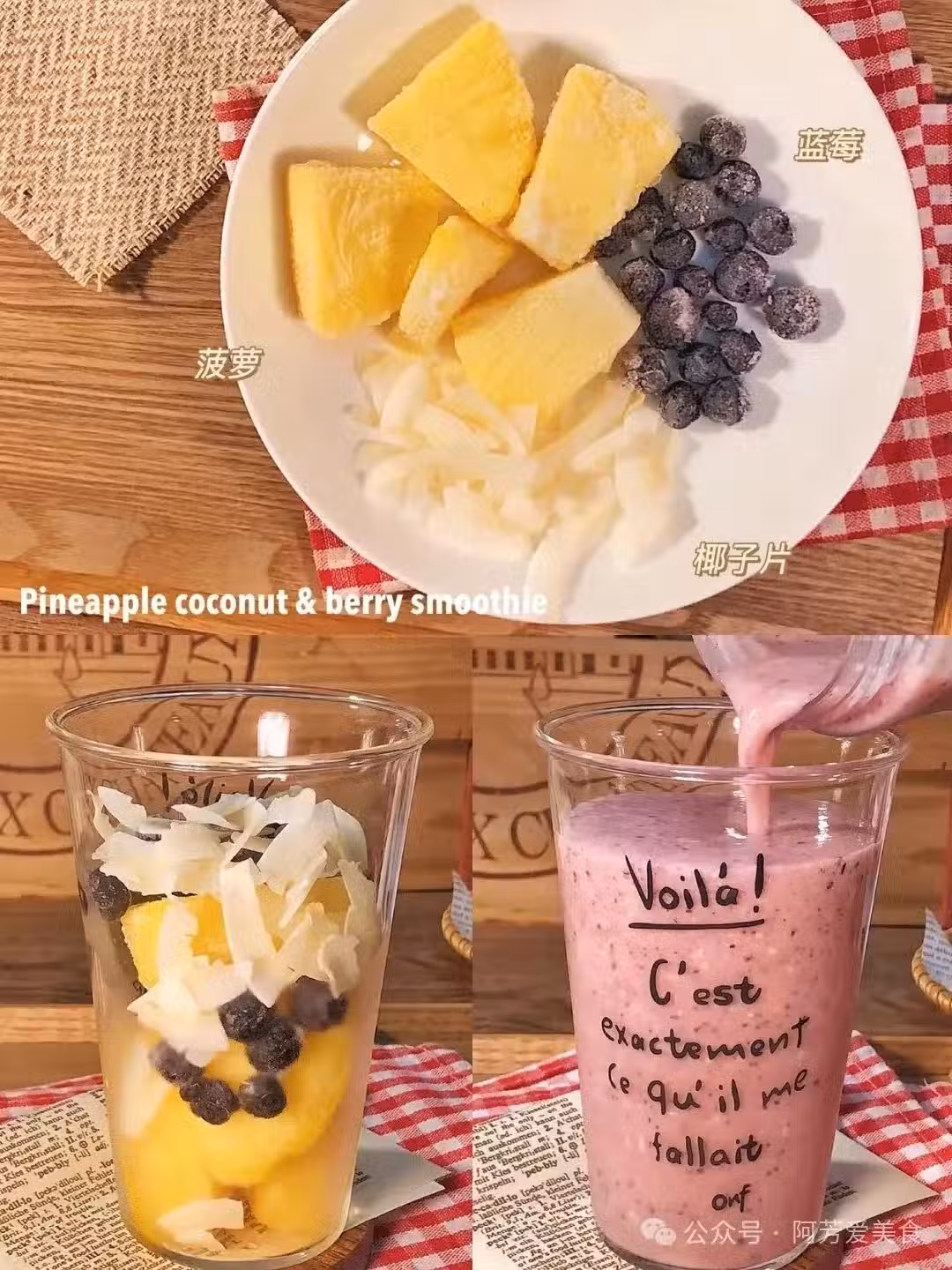菠蘿加藍莓還有椰子片,這款很適合小朋友們喜歡,不如酸酸甜甜的口感融合藍莓的香甜,還有椰子片酥脆爽口,喝起來簡直是很濃稠又好喝。