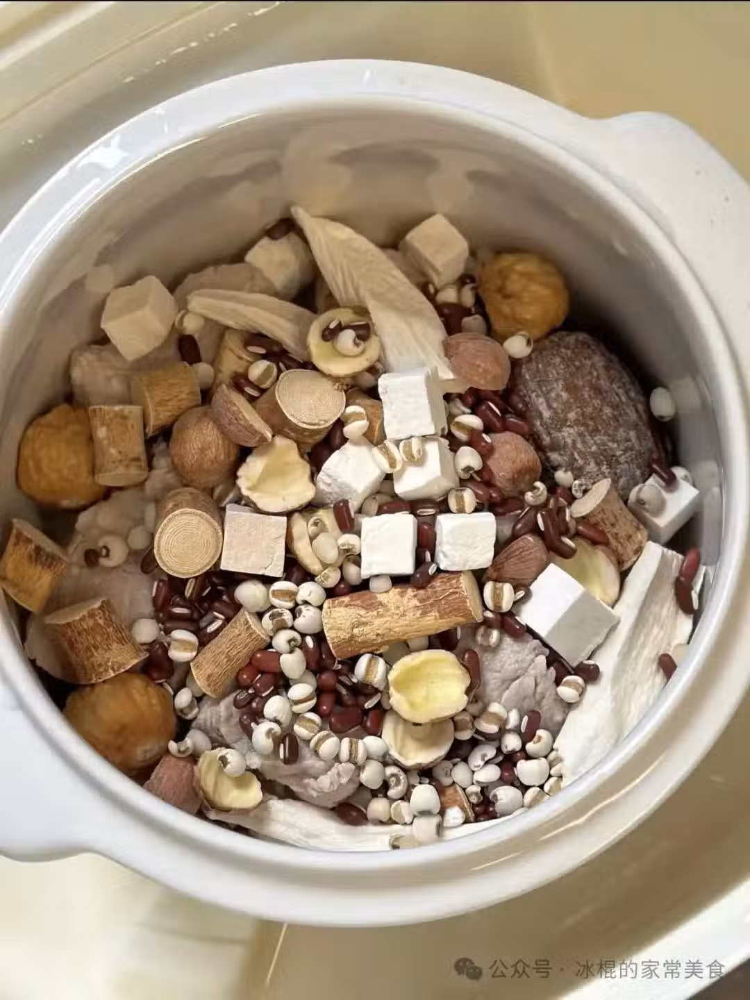 五指毛桃20克,赤小豆20克,炒薏米15克,紅蓮10克,茯苓10顆,山藥10克、陳皮1瓣、蜜棗1顆(無花果3顆也行),豬骨200克