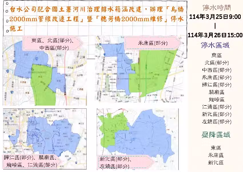 有關停水、供水站與相關問題,可撥打客服專線 1910或台南各區服務所:台南給水廠 、台南服務所、永康服務所、新市服務所、歸仁服務所,民眾亦可至台水停水公告網站查詢最新資訊。
